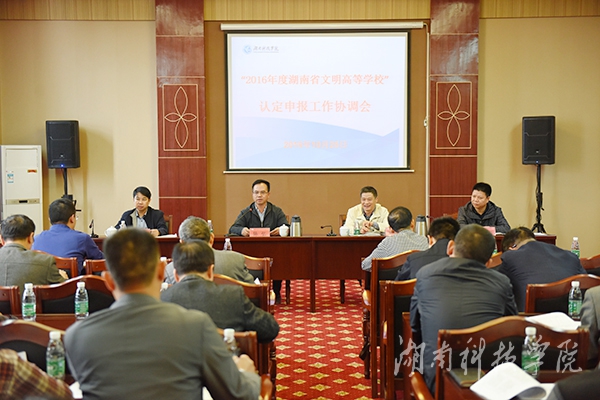 本网讯(记者 张云芳)为切实推进省文明高校创建,10月25日下午,学校召开 “2016年湖南省文明高等学校” 申报认定工作协调会。校党委书记陈弘出席并就省文明高校创建提出具体要求。校党委副书记唐艳明就省文明高校创建进行具体部署。副校长李常健、程智开出席。