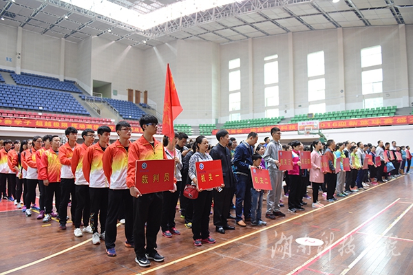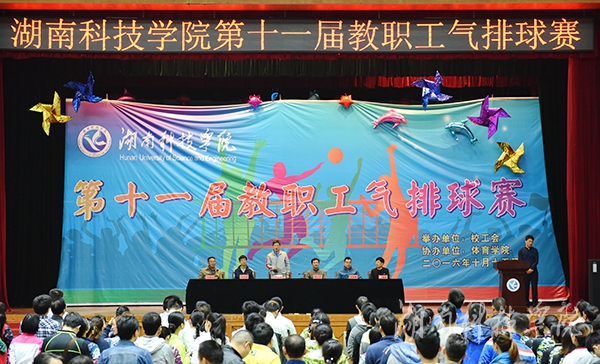 本网讯(记者 邓肖华 实习记者 洪年霞 摄影 何帅文)10月15日下午,在庄严的国歌声中,德赢官网第十一届教职工气排球赛在体育馆拉开帷幕。校党委副书记唐艳明,副校长吴小林等出席。工会常务副主席屈长青主持。
