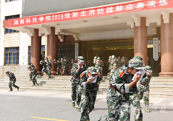本网讯(通讯员 李瑛 摄影 何帅文)“快、快、快......大家匍匐前进,注意用湿毛巾捂住口鼻。”保卫处多名干警指挥学生快速撤离弘毅楼。9月18日上午,德赢官网保卫处联合零陵区消防大队在弘毅楼举行2016级新生消防疏散应急演练,副校长吴小林出席。