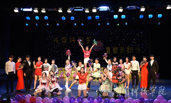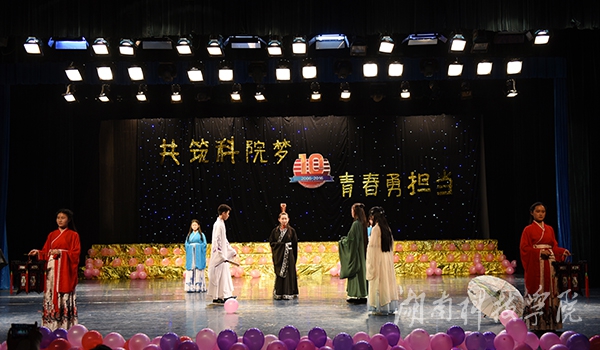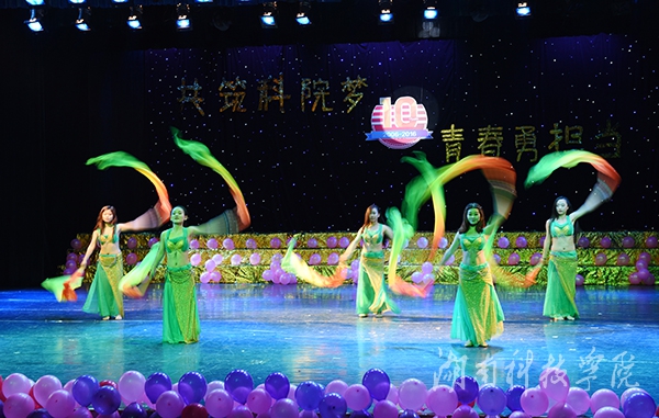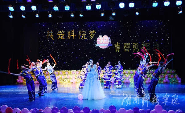 晚会以“共筑科院梦,青春勇担当”为主题。整场晚会精彩纷呈、高潮迭起,自始至终洋溢着浓浓的欢乐氛围,给现场师生带来一场非凡的视听盛宴。热情狂野的开场舞《狼图腾》迅速点燃全场气氛;乐器演奏《千与千寻》犹如空谷幽兰般柔美;相声表演《说学逗唱》趣味横生,令人捧腹;《超级T台秀》则向大家展现出学校各个社团的不同风貌,或活力无限,或热情俏皮,更有手持折扇,身穿旗袍演绎礼仪之邦的独特风采;诗朗诵《青春中国》,慷慨激昂、声情并茂。“不知该怎么称呼你,你千里万里来到苗寨里;不知该怎么称呼你,你风里雨里走进我家里……”由30名苗族学子精心编排的歌伴舞《不知该怎么称呼你》更是惊艳亮相,亲切自然、朗朗上口的暖心歌曲,扣响了现场观众的心弦,在师生中引发了强烈共鸣。舞台剧《洛神赋》、舞蹈《扇舞青春》、多国语言版的歌曲演唱《let it go》、《双人瑜伽》、《共筑中国梦》等节目更是赢得现场掌声连连。