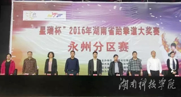 本网讯 4月23日至24日,2016年湖南省跆拳道大奖赛永州分区赛在德赢官网举行。副校长李常健、程智开,湖南省跆协副秘书长王卫华及体育学院党总支书记何智强、副院长刘根发出席。