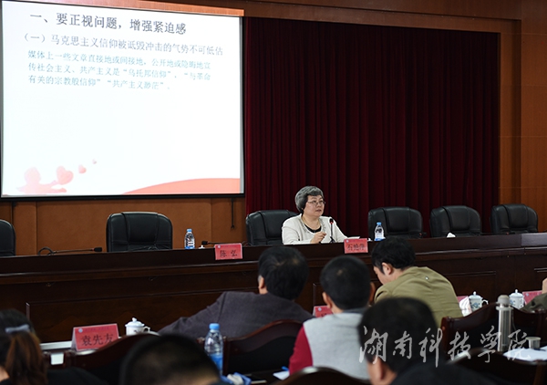 本网讯(记者 裴滢 摄影 何帅文)为切实加强意识形态工作,牢牢把握意识形态主动权,4月15日上午,学校党委邀请中共永州市委常委、宣传部部长石艳萍来校作题为“把意识形态工作紧紧抓在手上”的专题讲座。校党委书记陈弘主持并讲话。