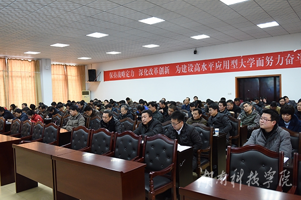 本网讯 (摄影 何帅文) 1月21日上午,学校在行政办公楼八楼一会议室召开全体中层干部大会。校党委书记陈弘出席并讲话,强调抓好干部队伍建设,充分发挥中层干部在学校转型发展中的积极作用。校长曾宝成总结回顾了一年以来的各项工作,并详细部署寒假工作。