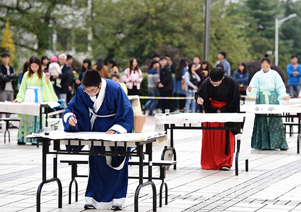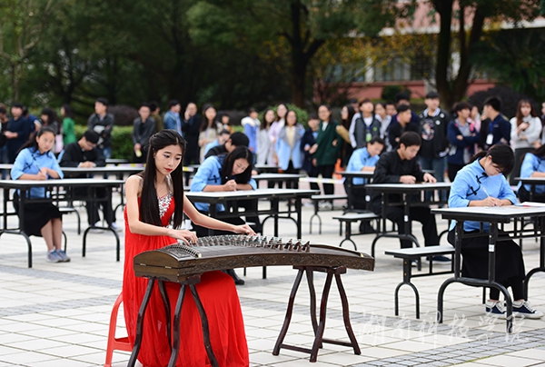 本网讯(实习记者 张婉静 杨光月 刘梦雅 摄影 何帅文)翰墨激浊流,妙笔扬清风。11月22日上午,伴随着悠扬、飘逸的古筝演奏,由校团委主办,美术与艺术设计学院承办的以“学廉、倡廉、爱廉"为主题的现场书法大赛吸引了近500名师生同场竞技。