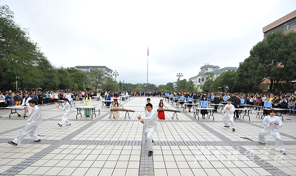 伴随着轻柔舒缓的古筝乐声响起,太极拳表演者以抱拳动作起势,连贯又不失节奏。全身柔绵而有力地开始摆动,每一个动作灵活有力,与悠悠飘扬的筝音相依,柔和中带有几分刚劲,传统艺术的气息萦绕全场。