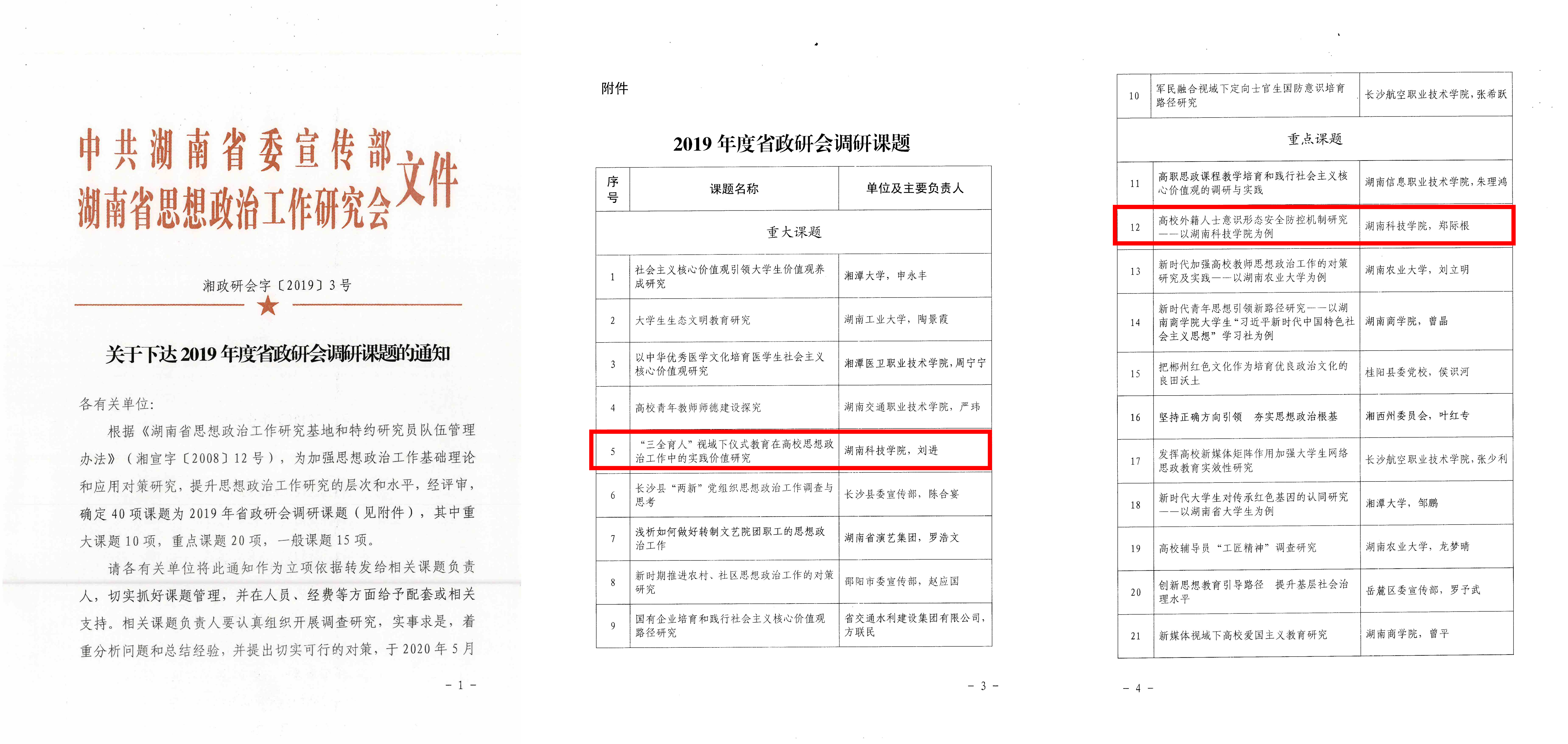 本网讯 12月23日,中共湖南省委宣传部、湖南省思想政治工作研究会发布《关于下达2019年度省政研会调研课题的通知》,德赢官网旅游与文化产业学院教师刘进申报的《“三全育人”视域下仪式教育在高校思想政治工作中的实践价值研究》获重大课题立项,国际交流与合作处处长郑际根申报的《高校外籍人士意识形态安全防控机制研究——以德赢ac米兰官方合作vwin为例》获重点课题立项。