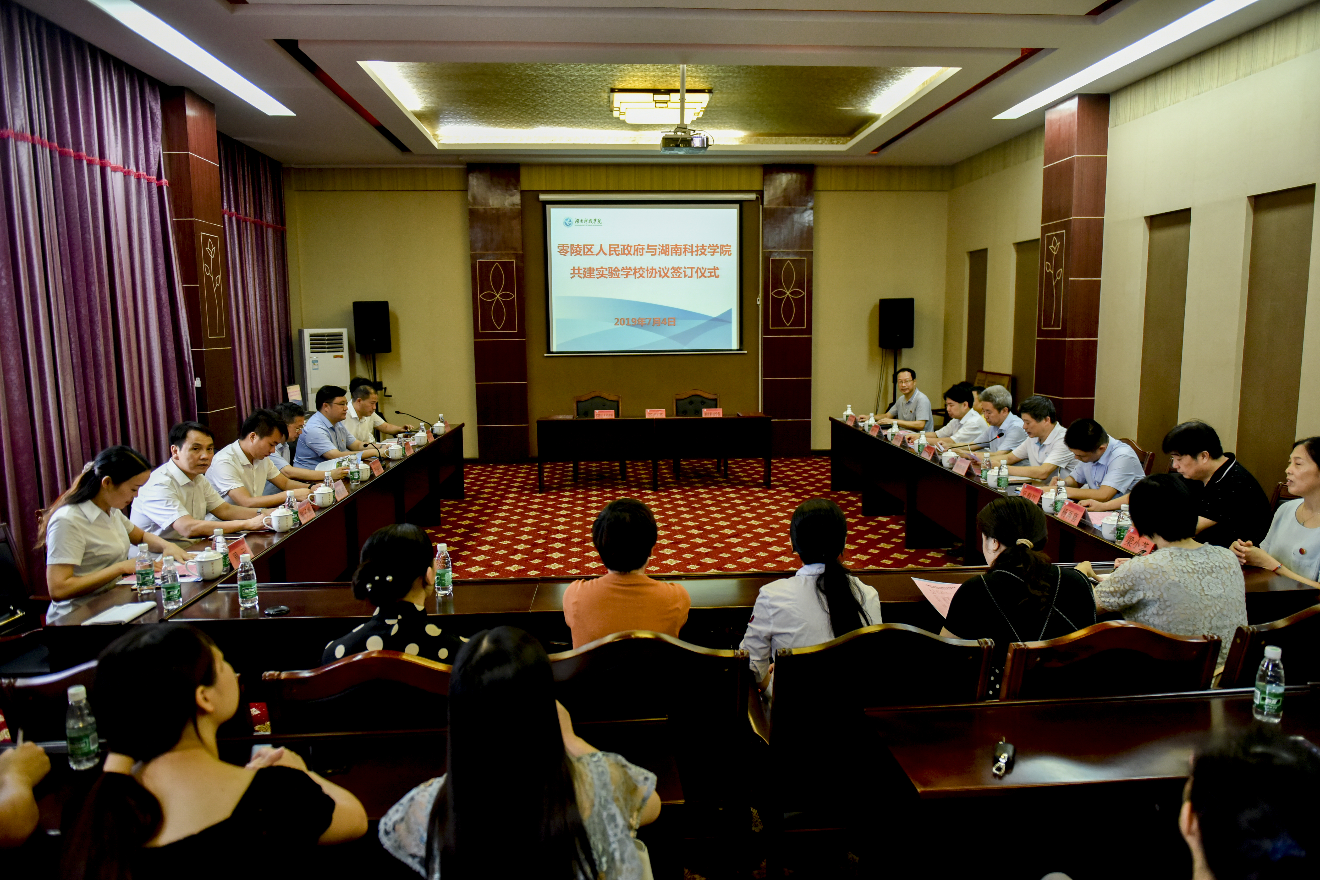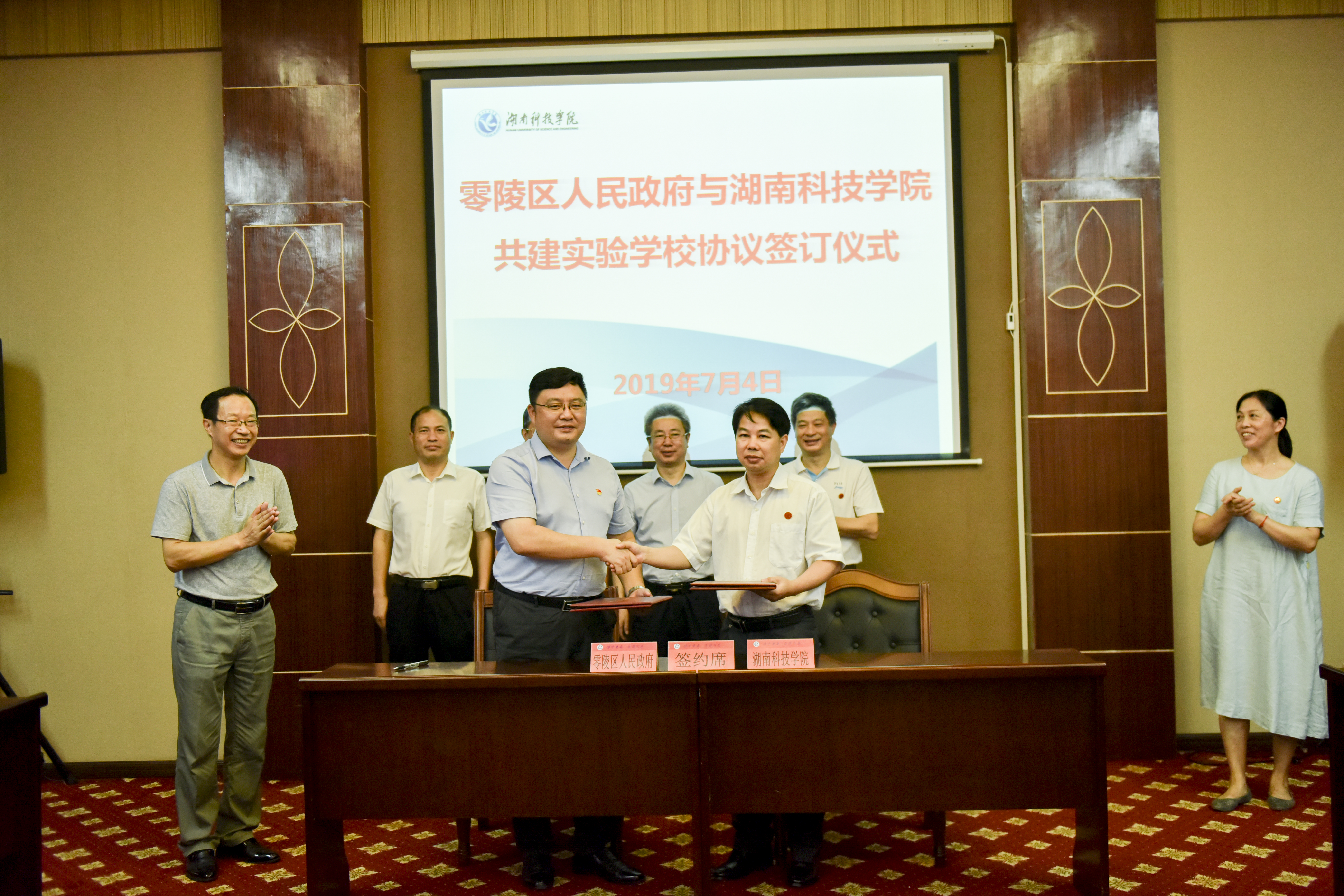 李常健代表学校、张国材代表零陵区人民政府现场签订共建实验学校协议。唐艳明、张国材分别为零陵区杨梓塘小学、永州九中授予“零陵区人民政府、德赢ac米兰官方合作vwin共建实验学校”的牌匾。