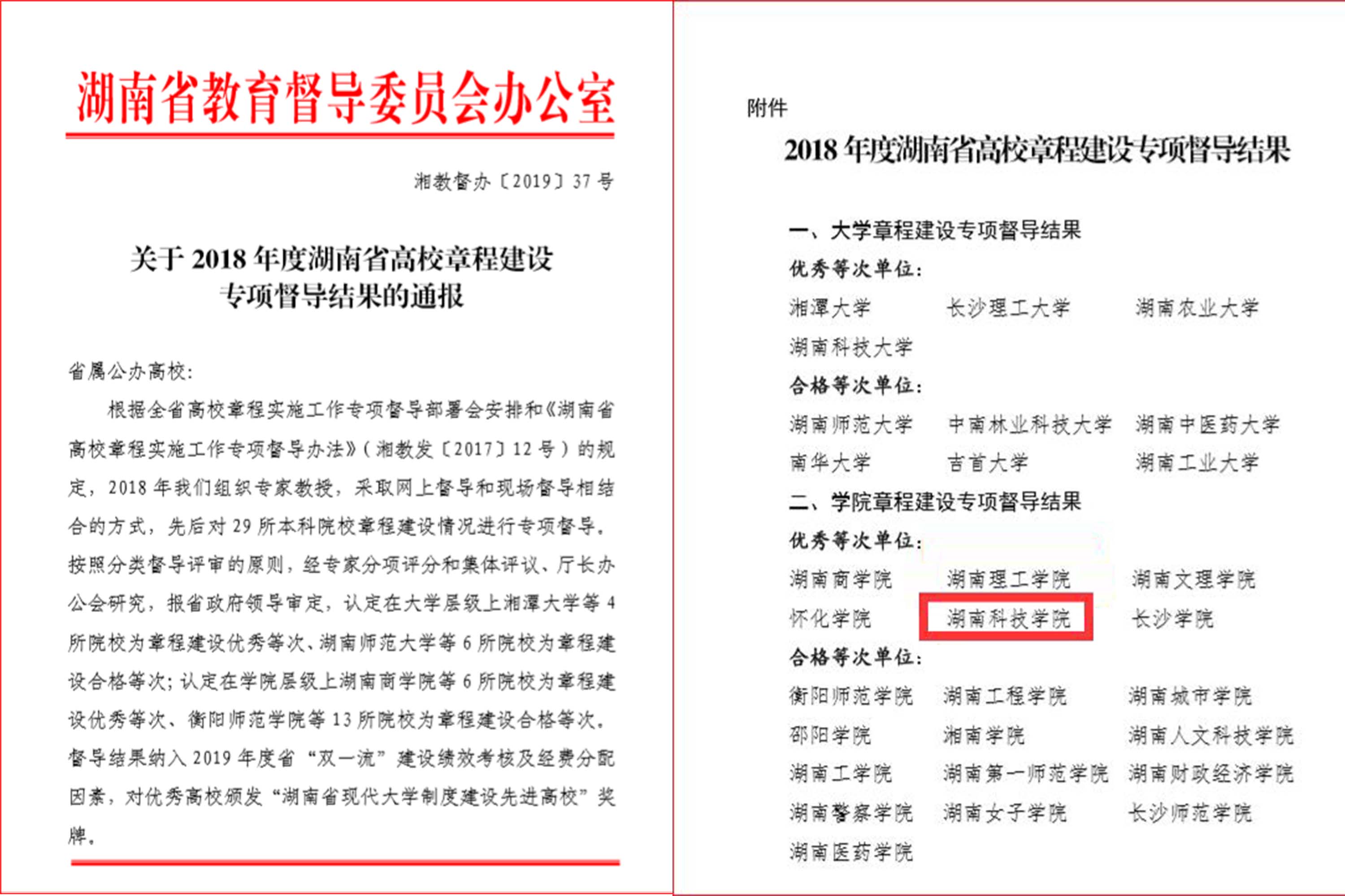 本网讯 近日,湖南省教育厅公布了高等学校章程建设专项督导结果,德赢官网被认定为章程建设“优秀”等次单位,被授予“湖南省现代大学制度建设先进高校”荣誉称号。