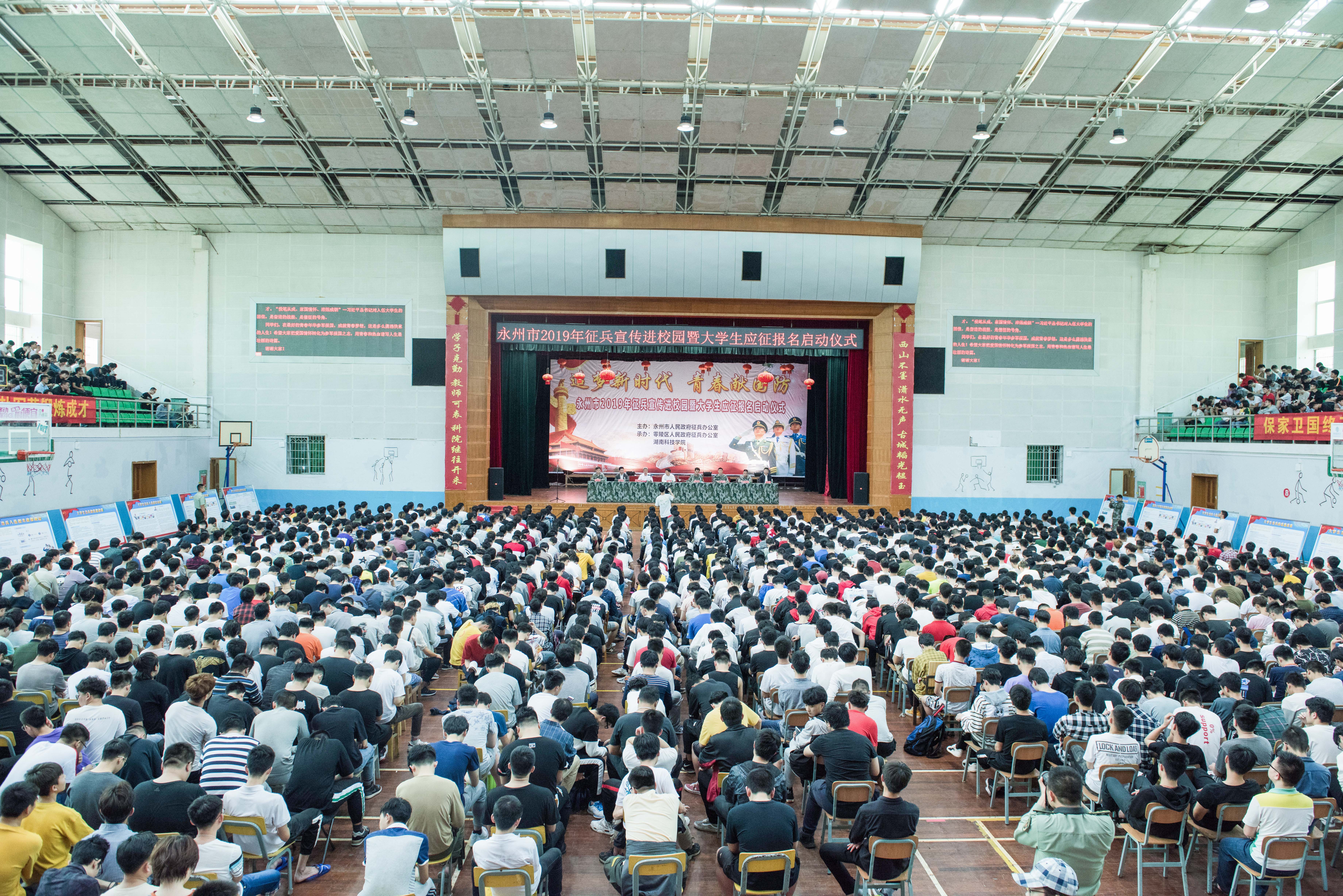 本网讯 建功新时代,青春献国防。4月23日,永州市2019年征兵宣传进校园暨大学生应征报名在德赢官网启动,市委常委、市委宣传部部长贺辉,市委常委、军分区政委冯紫英,军分区副司令员陆鸿,军分区动员处处长唐柳军,零陵区委常委、区人武部部长王建武,德赢官网党委书记、校长曾宝成,副校长程智开,学工部、武装部长唐华山以及3000余名学生参加启动仪式。仪式由陆鸿主持。