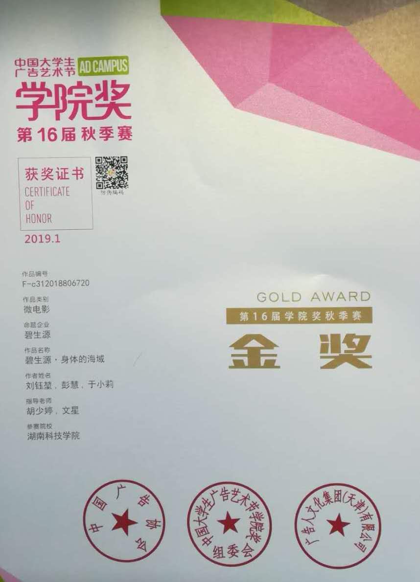 本网讯 1月10日,第16届中国大学生广告艺术节学院奖秋季赛创意盛典在北京梅地亚中心盛大举行。德赢官网传媒学院刘玉堃、彭慧和于小莉同学创作的作品《碧生源,身体的海域》,在20多万件竞赛作品中脱颖而出,获得本次大赛微电影类金奖。指导教师胡少婷和文星老师分别获“金牌指导教师”荣誉称号。这是德赢官网在这一赛事上的一大突破,也是本次大赛湖南省唯一获此奖项的高校。同时,传媒学院学子还获得优秀奖19项,佳作奖21项。