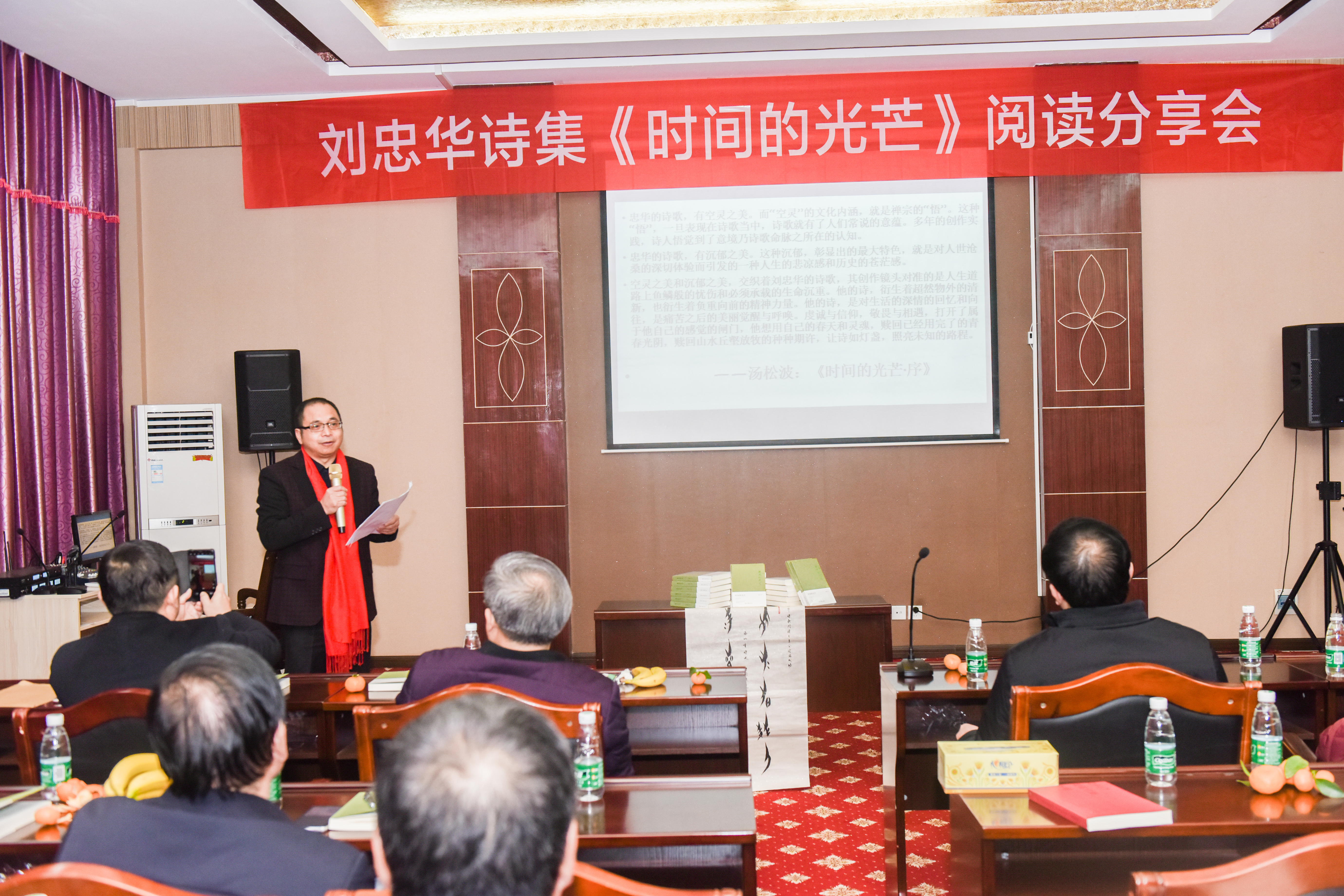 省诗歌学会副会长、市委宣传部常务副部长蒋三立简要评析了刘忠华诗歌的创作特色,充分肯定了他“扎根生活、行吟潇湘”的写作姿态。蒋三立强调,诗人也好,作家也罢,不能关在屋子里闭门造车,一定要走出去,走向大地和人民,走向火热的生活,以自己的实际行动落实习近平总书记提出的“坚持以人民为中心”的文艺创作思想,努力创作出无愧于时代的优秀作品,大力讲好中国故事,展现中国气象,反映中国精神。