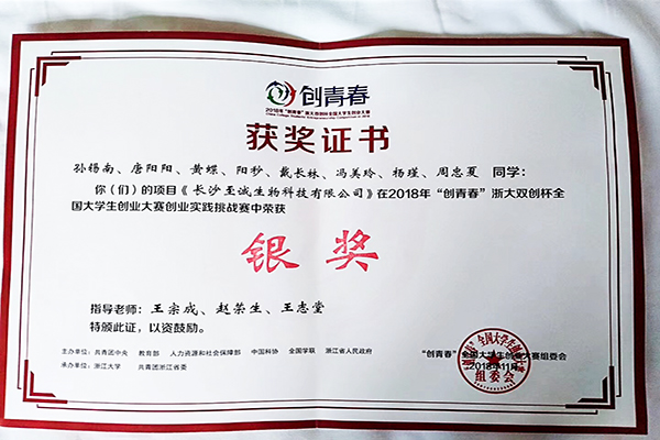 本网讯 11月3日,由共青团中央、教育部、人力资源和社会保障部、中国科协、全国学联、浙江省政府主办,浙江大学、浙江团省委承办的2018年“创青春”浙大双创杯全国大学生创业大赛决赛落下帷幕。经过多轮比拼,德赢官网由王宗成、赵荣生、王志堂老师指导,孙锡南、冯美玲等同学的作品《长沙至诚生物科技有限公司》喜获创业实践赛银奖,湖南省在此次大赛中斩获2金9银33铜,德赢官网成为全省夺银的两所二本院校之一。