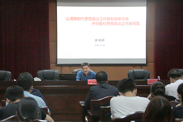 唐艳明以“认清新时代思想政治工作新形势新任务,开创德赢官网思想政治工作新局面”为主题,紧紧围绕党的十九大报告和习近平总书记在全国高校思想政治工作会议上的重要讲话精神,从深刻理会新时代高校思想政治工作新精神新要求、准确把握新时代高校思想政治工作新形势新挑战、认真落实新时代高校思想政治工作新使命新任务三个方面作了精彩的辅导报告。