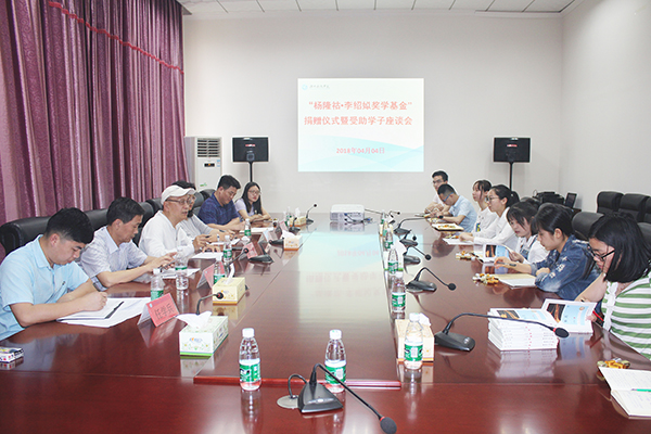 本网讯 4月4日下午,“杨隆祜·李绍姒奖学基金”捐赠仪式暨学生座谈会在校举行。“杨隆祜·李绍姒奖学基金”主席杨盛成先生携夫人祝幼光女士、湖南省人民政府外事侨务办侨政处副处长赵三元、德赢官网学生工作部负责人、化生学院曹林艳博士及受助学生出席。9名学生获 “杨隆祜·李绍姒奖学基金”资助。