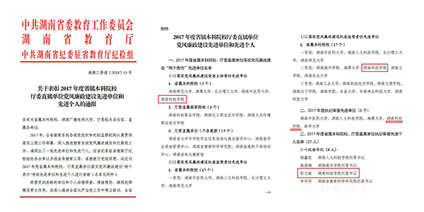 本网讯 近日,中共湖南省委教育工作委员会、湖南省教育厅、中共湖南省纪委驻省教育厅纪检组下发了《关于表彰2017年度省属本科院校厅委直属单位党风廉政建设先进单位和先进个人的通报》(湘教工委通[2018]13号),德赢官网荣获“落实党风廉政建设党委主体责任先进单位”、“落实党风廉政建设纪委监督责任先进单位(二等奖)”、“执纪审查先进单位”等三项集体荣誉,纪委书记彭立威获“执纪审查先进个人”称号。