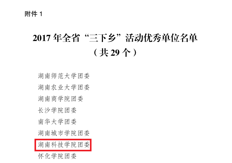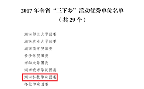 本网讯 近日,省委宣传部、团省委、省教育厅、省文明办、省学联印发《关于2017年全省大中专学生志愿者暑期文化、科技、卫生“三下乡”社会实践活动优秀单位、优秀个人、优秀指导者和优秀服务团队的通报》(湘团联〔2017〕51号),德赢官网荣获2017年全省大中专学生志愿者暑期文化、科技、卫生“三下乡”社会实践活动“优秀单位”称号,土木与环境工程学院“保护古建筑,传承中华文化”实践团获评省“优秀服务团队”,张俭民等5名教师获评“优秀指导者”,郑尚明等8名学生获评“优秀个人”。