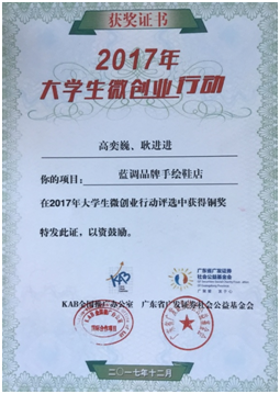 2017年大学生微创业行动由KAB全国推广办公室、广发证券社会公益基金会主办。本次大赛以“寻找互联网梦想+”为主题,全国共有300余所高校的1443个项目参加竞逐,最终评出金奖10名、银奖20名,铜奖20名及组织奖20名,获得微创业扶持资金总计100万元。