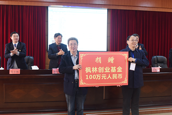 本网讯 11月26日,北京枫林公益基金会会长、学校北京校友会会长、77级化学专业校友张亚红向学校捐赠100万元创业基金,鼓励和支持在校学生创新创业。校领导曾宝成、唐艳明、宋宏福、李常健、吴小林出席。