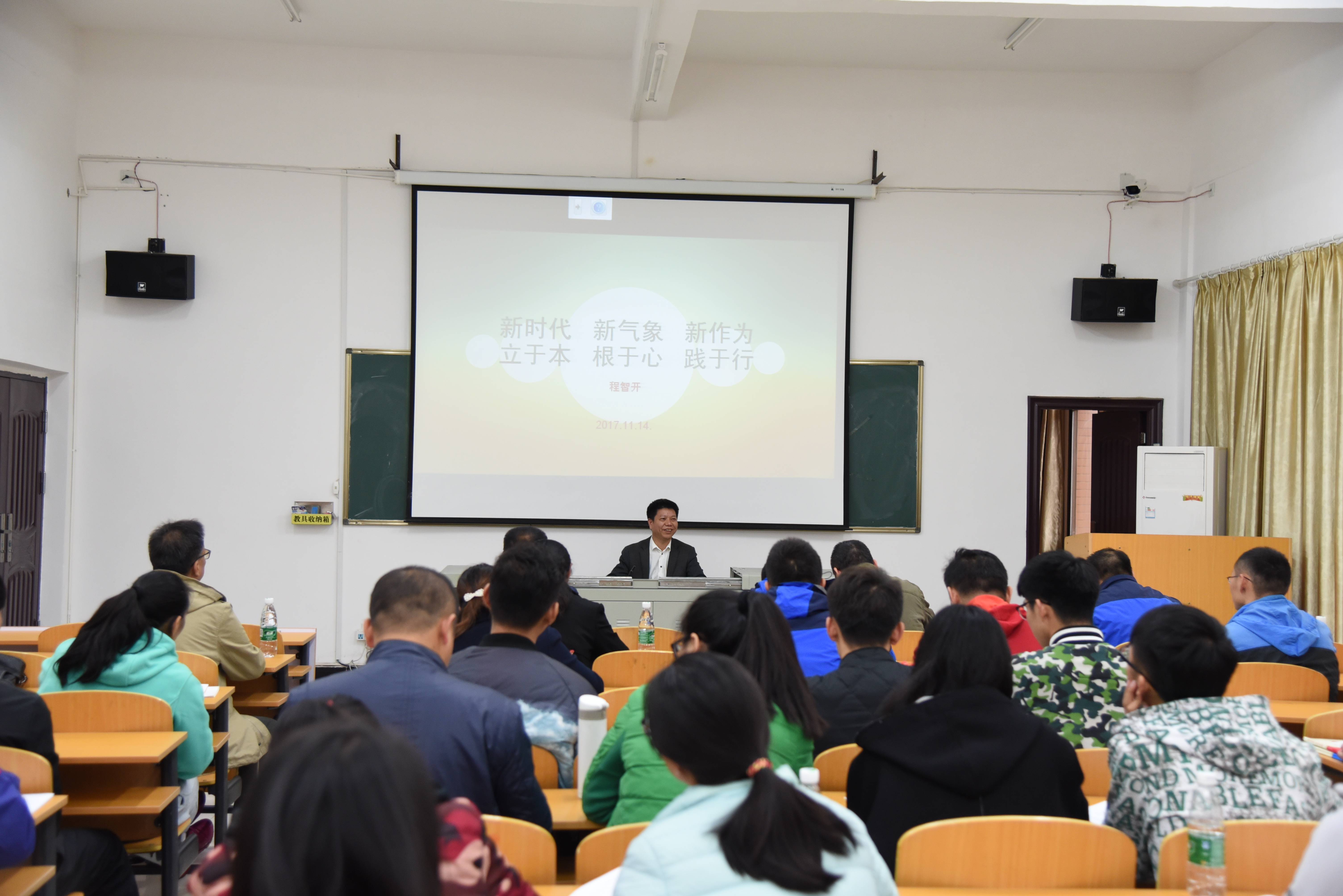 本网讯    11月14日下午,副校长程智开以《新时代、新气象、新作为,立于本、根于心、践于行》为题为体育学院全体师生党员上专题党课,辅导大家深入学习贯彻党的十九大精神。