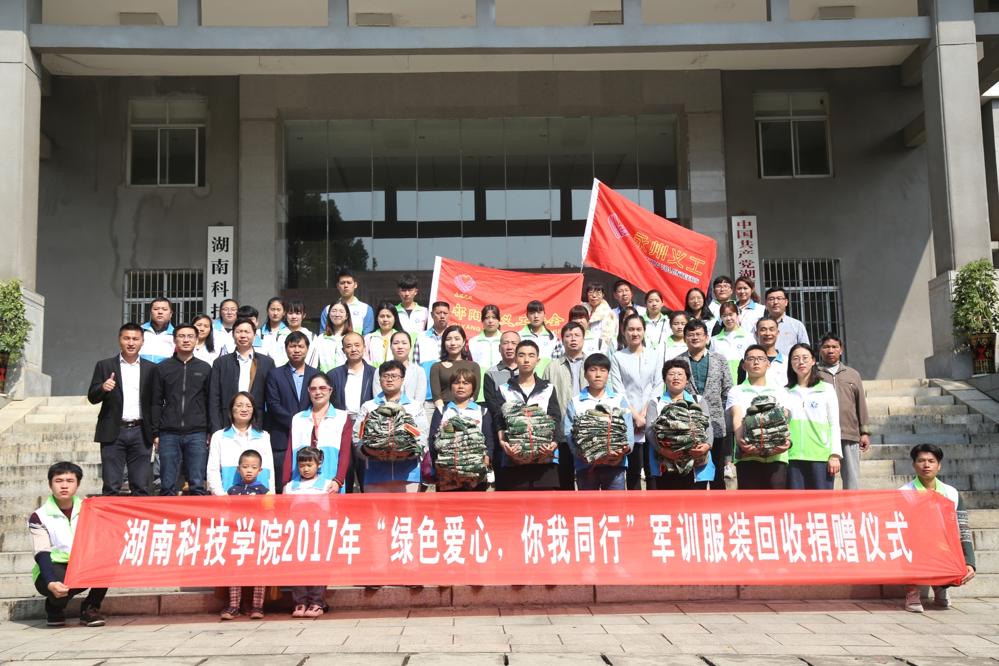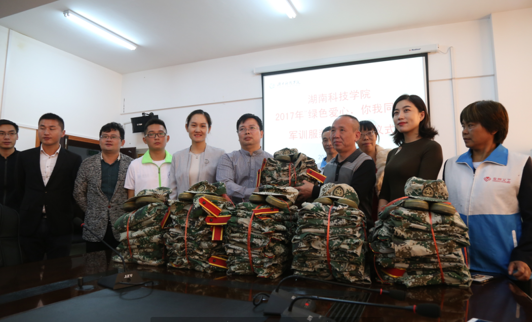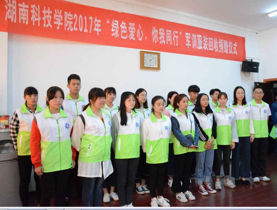 本网讯 10月29日上午,德赢官网举行“绿色爱心,你我同行”军训服装爱心捐赠仪式。永州市文明办副主任周秋平,校团委、理学院等相关负责人参加活动。