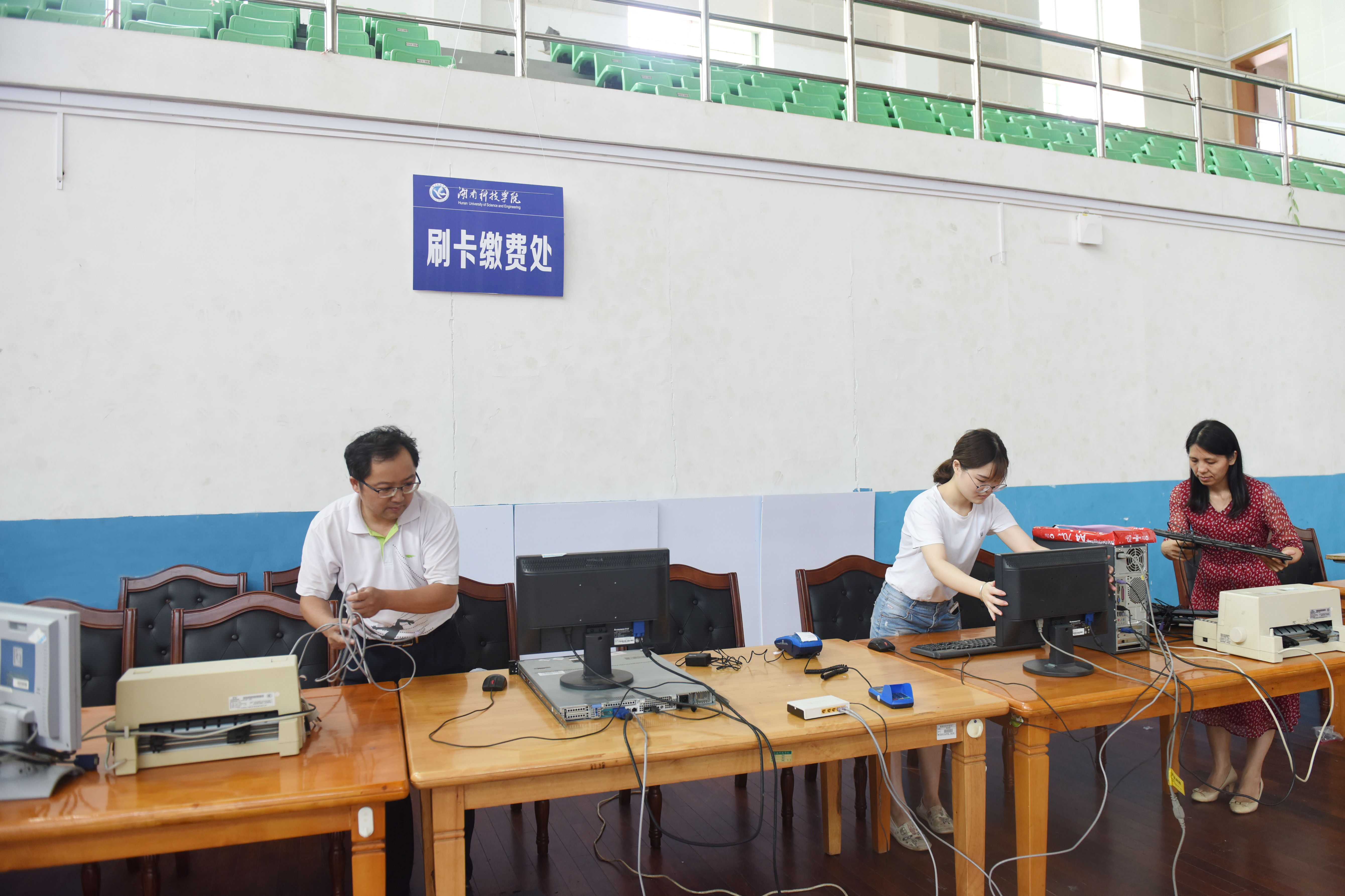 学校体育馆内,工作人员在将现场缴费设备进行安装调试。