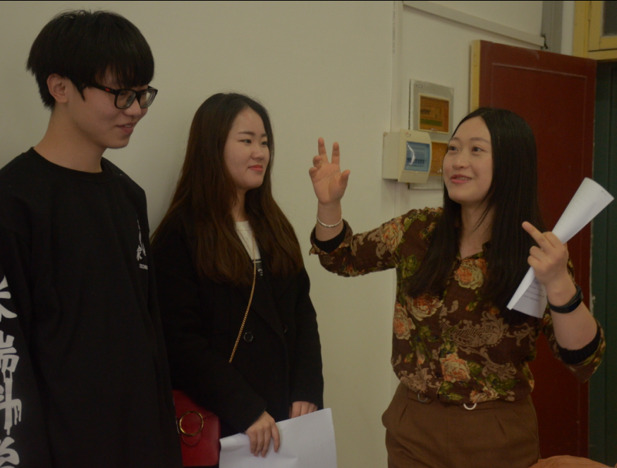 小组同学和胡老师探讨话剧表演中的情景设定和英文表述。