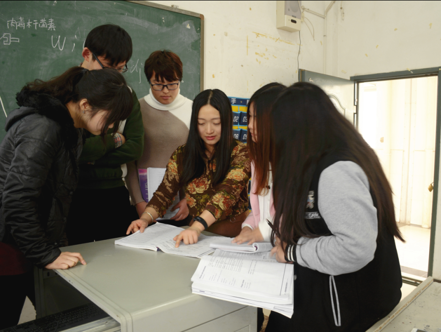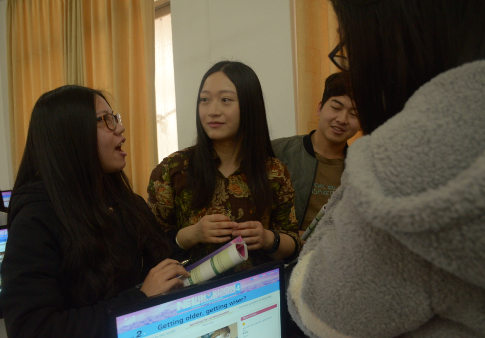 胡老师开始了自己今天的第一次授课——大学英语读写课。胡老师用启发式教学法带着学生们一起深度思考、理解课文,阅读过后给学生安排小组讨论任务,她也积极参与到小组的话题讨论中了解并指导学生的思路。
