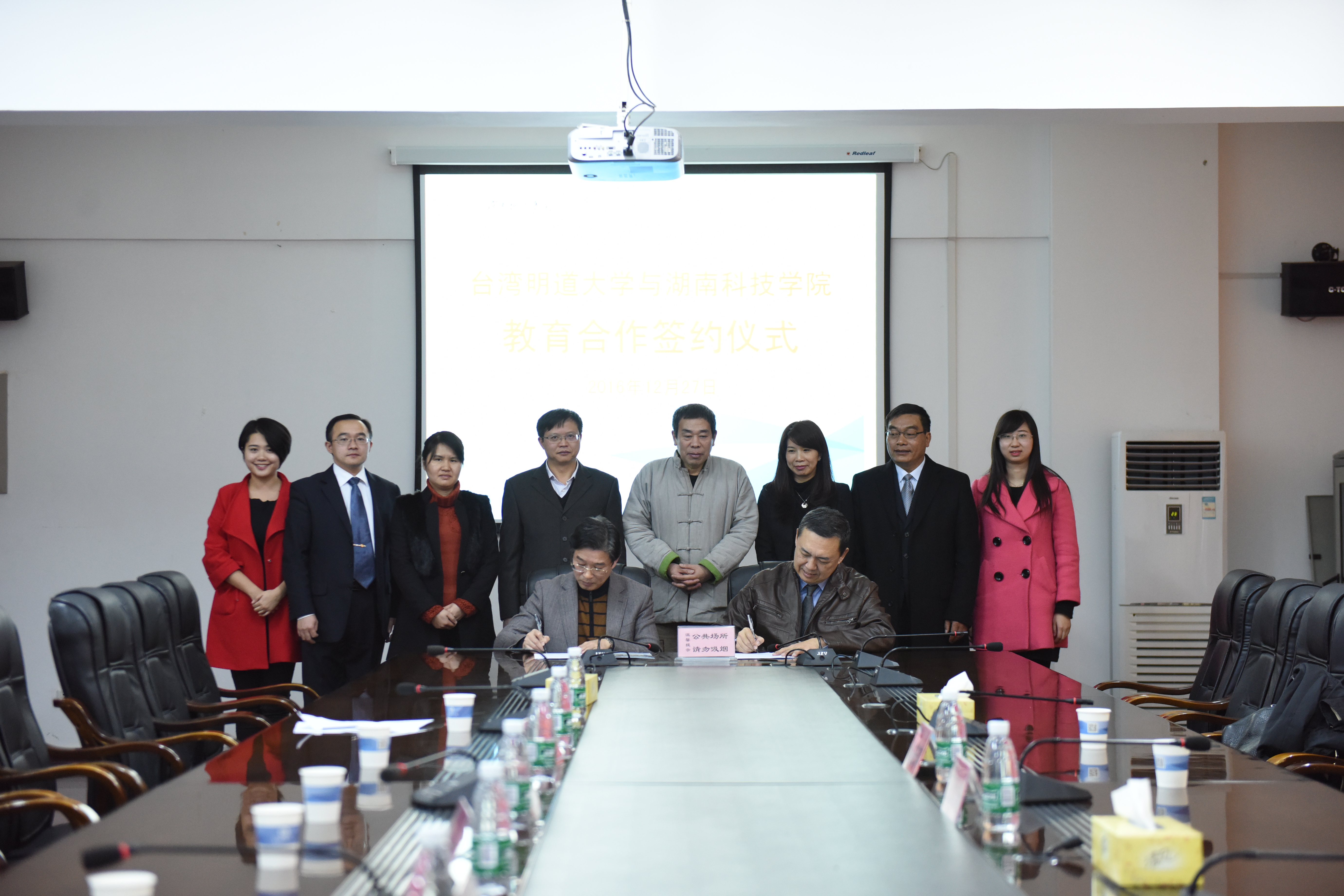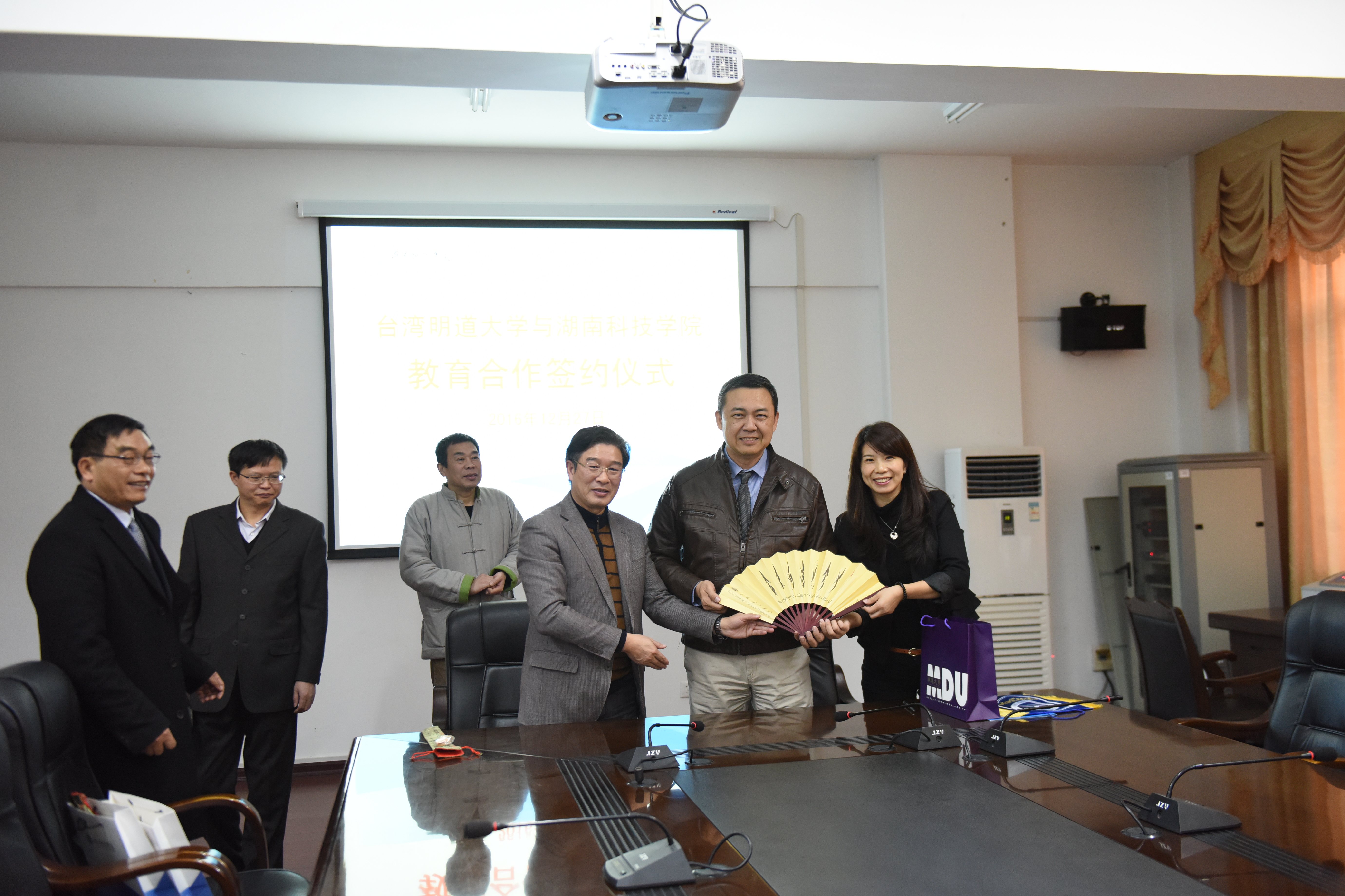 洽谈会在亲切和睦的氛围中进行。副校长宋宏福代表学校欢迎汪大永一行的来访并从办学历史、专业设置、对外交流等方面介绍了学校发展概况和永州深厚的历史文化底蕴。汪大永介绍了台湾明道大学“人文立校、注重科技”的办学理念、学校发展历史、科研产业化、国际交流等方面情况。