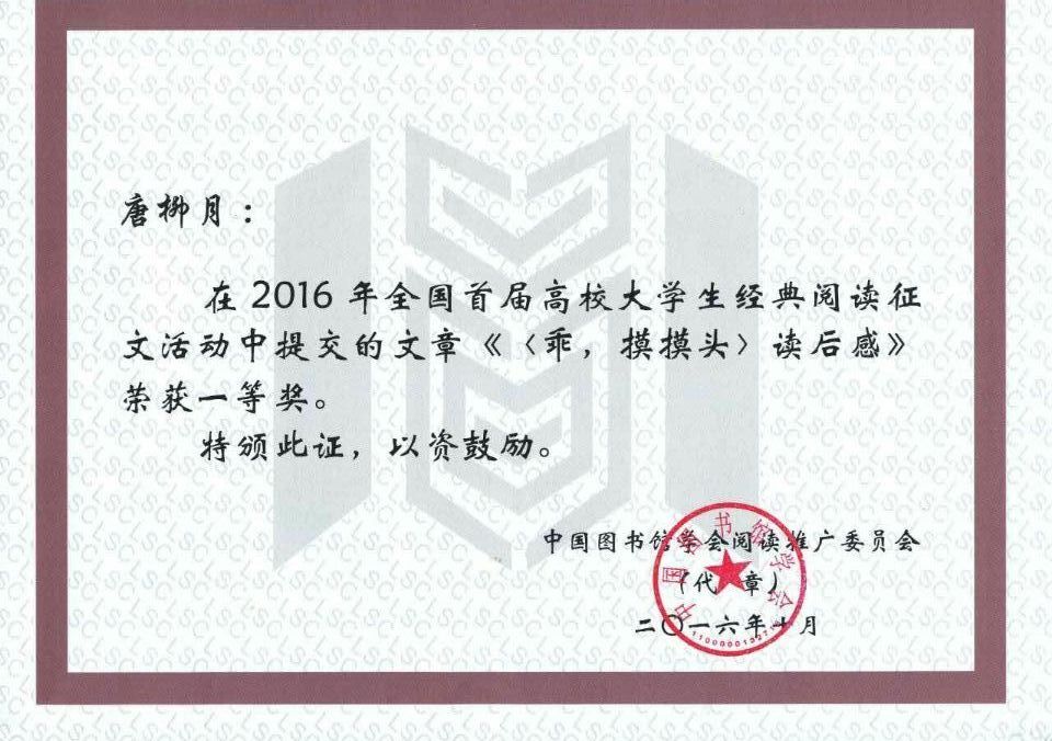 本网讯 近日,全国首届高校大学生经典阅读征文活动落下帷幕,由德赢官网图书馆推荐的唐柳月同学作品《< 乖,摸摸头>读后感》荣获一等奖。
