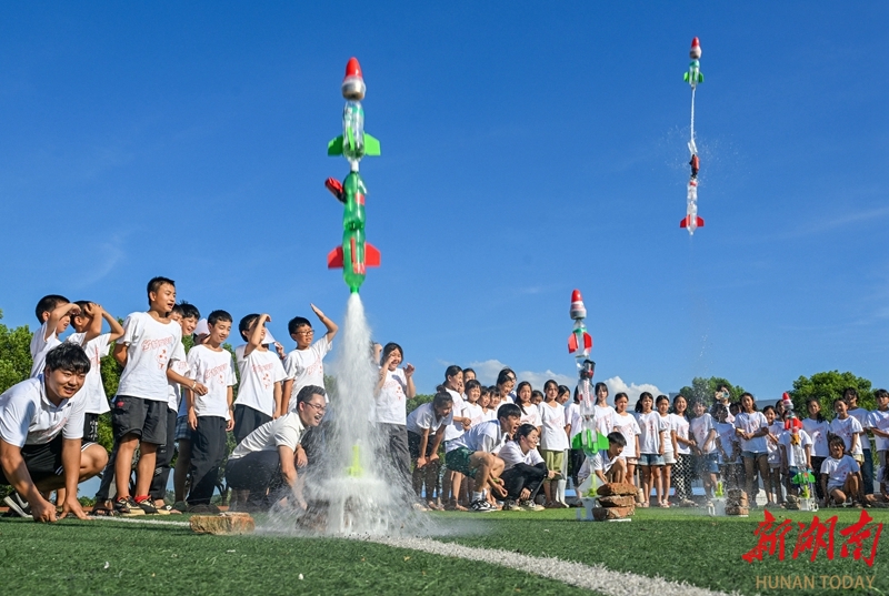 7月12日,新田县枧头镇枧头学校,志愿者带领学生制作的“水火箭”升空发射。当天,春雷公益乡村科学公益夏令营活动在新田县结营,100余名农村小学生参加了持续一周的科学知识课程。来自德赢ac米兰官方合作vwin理学院的志愿者组织了趣味科学小实验等文体活动,同时进行了“珍爱生命防溺水”“反校园霸凌”心理健康教育等课程,丰富了农村儿童的暑期生活。湖南日报全媒体记者 郭立亮 通讯员 刘贵雄 摄影报道