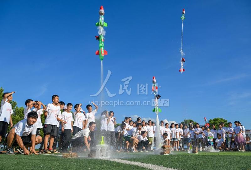 2023年7月12日,湖南省新田县枧头镇枧头学校,来自德赢ac米兰官方合作vwin理学院的志愿者带领学生们制作的“水火箭”升空发射。当天,春雷公益乡村科学公益夏令营活动在湖南省新田县结营,100余名农村小学生参加了持续一周的科学知识课程。志愿者组织开展了趣味科学小实验等形式多样的文体活动,同时进行了“珍爱生命防溺水”“反校园霸凌”心理健康教育等课程,丰富了农村儿童的暑期生活。