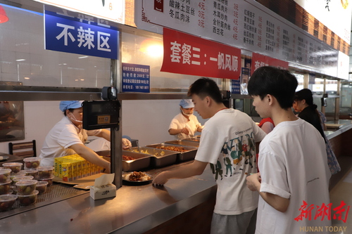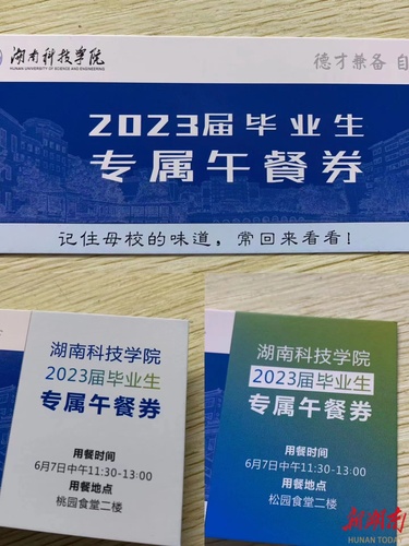 为了让每位毕业生都能吃到“毕业午餐”,学校在两周前就制作好“毕业餐券”,由各个学院组织发放。凭借这张餐券,学生可以在食堂吃到两荤两素的免费餐,除此之外,食堂还准备了可口的水果、饮料。永州血鸭、东安鸡、麻婆豆腐、红烧猪脚……学校精心推出“前程似锦”“大展宏图”“一帆风顺”三种美食套餐,蕴含着母校对毕业生满满的祝福。“还记得四年前的你们,穿着迷彩服在我的窗口前排着长队……即将离开学校,希望你们以后工作学习再忙,也要记得按时吃饭!”陪伴大家四年的食堂阿姨暖心的话语,深深打动了在座每一位即将离开母校的毕业生。