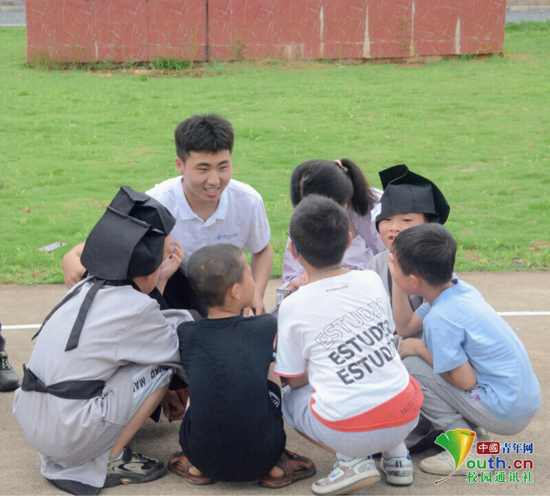 图为实践队员们与同学们一起转圈玩耍。中国青年网通讯员 黄彩燕 摄