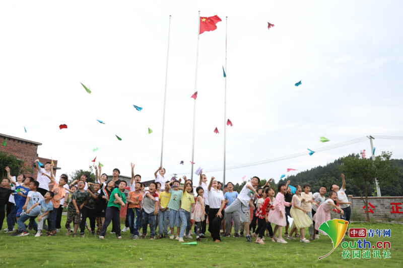 图为实践队员与同学一起放飞写着愿望的纸飞机。 中国青年网通讯员 黄彩燕 摄