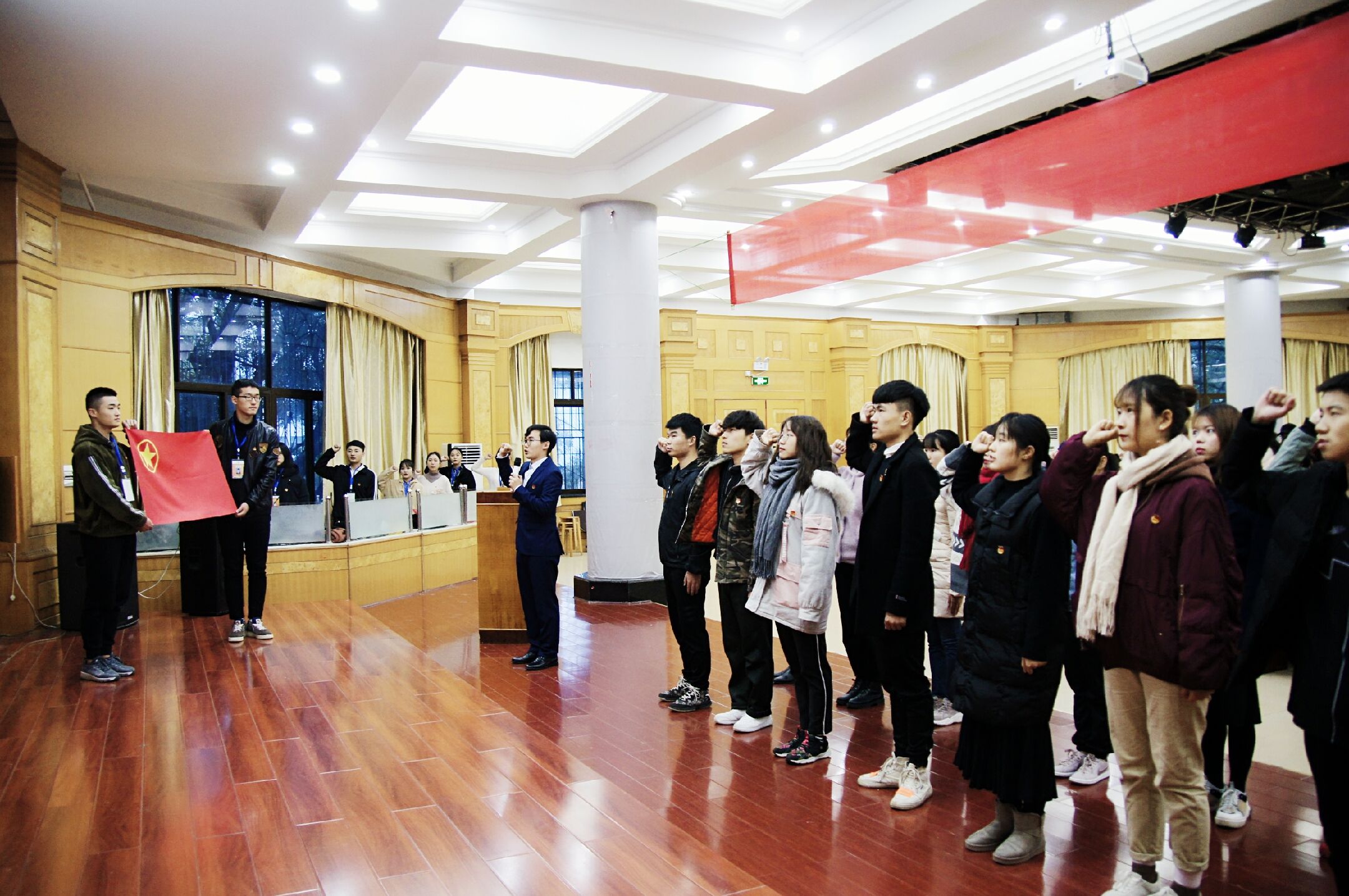 会上,校团委书记刘佳宣读关于成立德赢ac米兰官方合作vwin学生社团联合会团总支以及大学生外语协会、党建协会、习近平新时代中国特色社会主义思想研究与实践协会等13个社团团支部的决定。程智开、刘佳为新成立的团总支和社团团支部授团旗,校学生社团联合会团总支书记陈鑫作为领誓人,带领全体与会人员重温入团誓词。