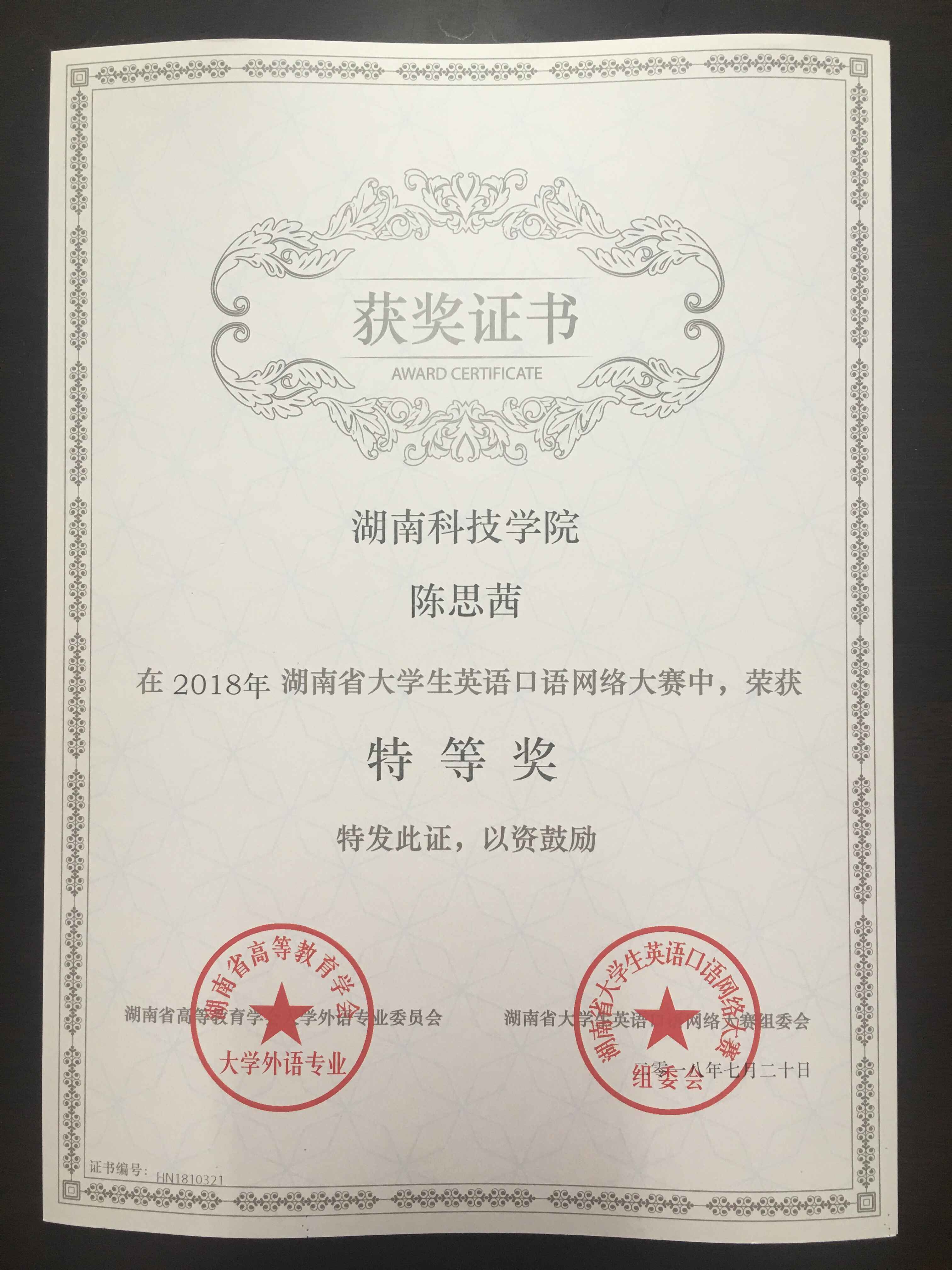 本网讯 在湖南省首届英语口语网络大赛中,德赢官网英语1504班陈思茜从决赛选手中脱颖而出,以第二名的成绩获得省特等奖。据悉,本次决赛共有来自全省三十九所高校的一百多名选手参加。 陈思茜同学非常刻苦,每天坚持在“FIF口语训练”APP上挑战时长为8分钟的赛题,一次次地刷新自己的记录,经200多分钟的反复挑战,最终获得97分的高分,荣获省特等奖。