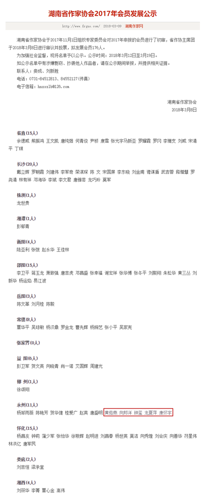 本网讯 3月9日,湖南省作家协会公示了湖南省作家协会2017年会员发展名单,德赢官网人文与社会科学学院黄茹燕、向邦洋、钟玺、龙夏萍、康怀宇五位同学成功入选湖南省作家协会会员。